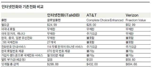 우선 월 기본요금($24.99/수수료포함)이 타 전화 서비스보다 저렴하다. 여기에 미국과 캐나다는 물론 한국을 포함한 세계 27개국에 무제한 국제전화를 제공하고 있어 한국에 자주 전화하는 한인들에게는 매우 편리하고 유리한 서비스다.