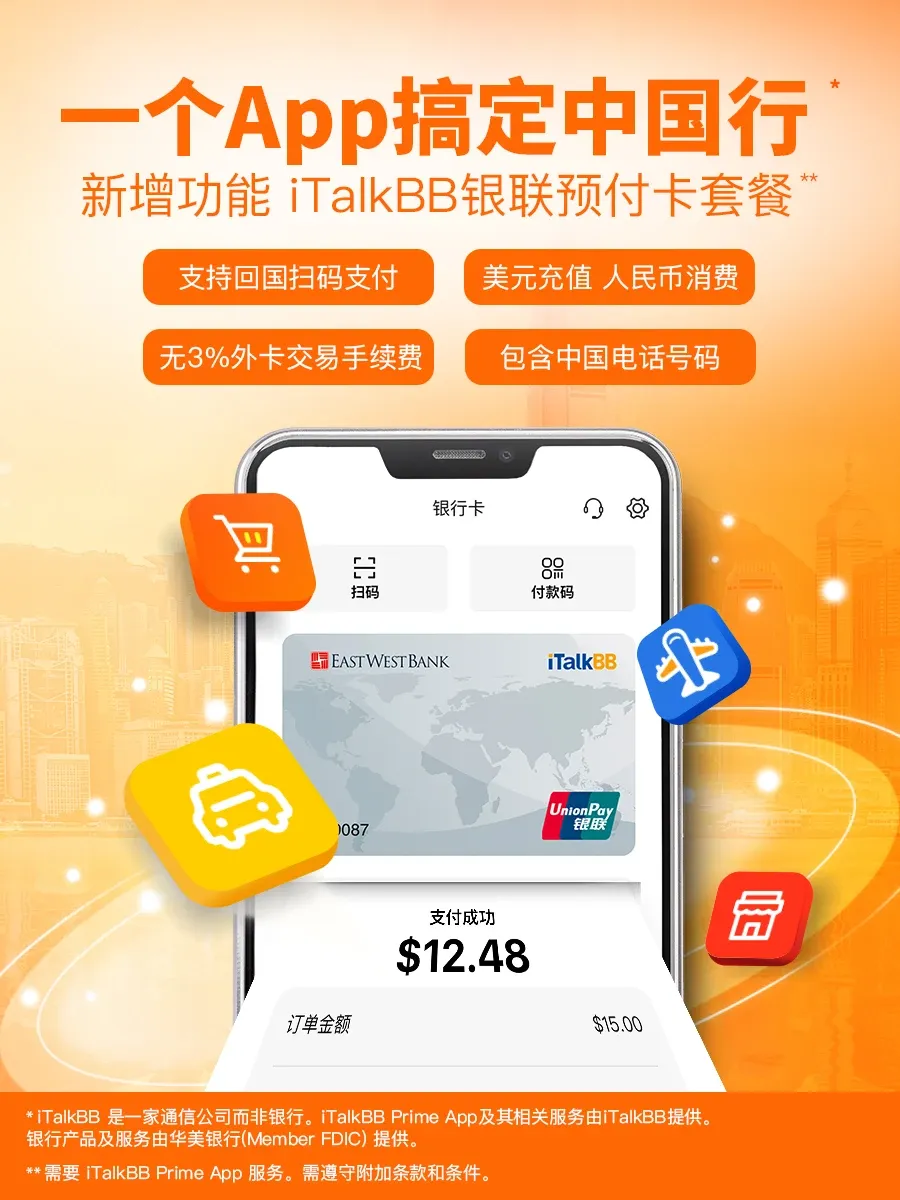 为华人设计! iTalkBB与银联国际、华美银行强强联手推出iTalkBB Prime App内首款为华人回国而定制的支付功能