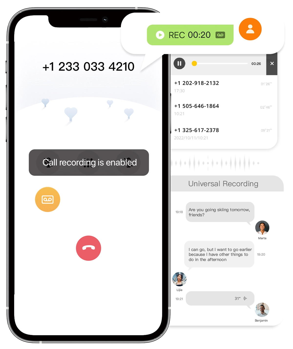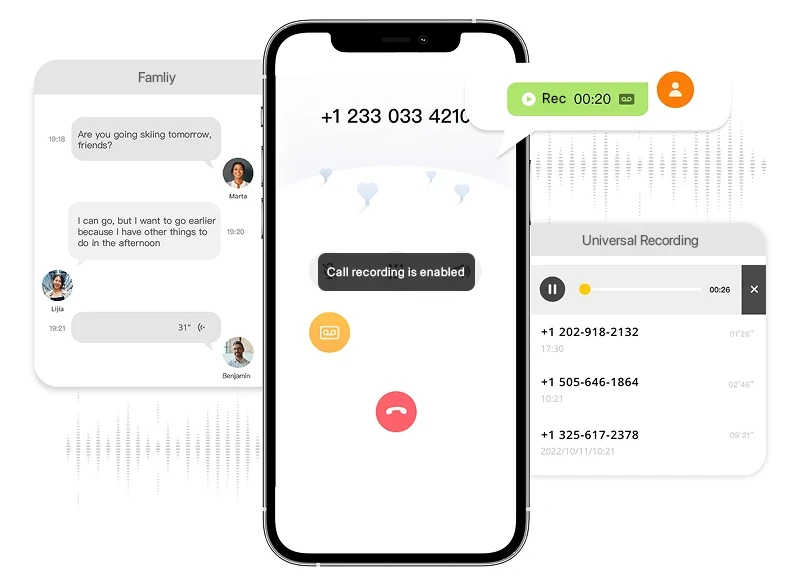 一键开启通话录音功能,让你随时随地轻松记录重要通话内容;录音文件本地储存,安全可靠;可建立群组,最多可与五人共享,来电提醒、通话记录、短信及语音留言;语音信箱,方便如微信语音,点开即听;无需中国电话卡,有网就能用APP内所有功能