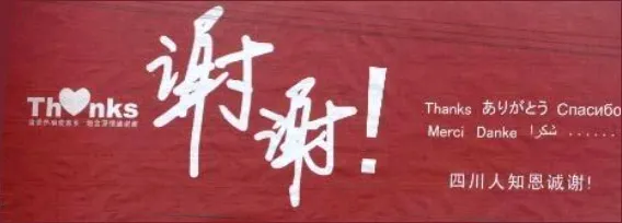 到了四川之后,在进城高速公路旁的一个广告牌吸引住了她的目光,上面很简单地写着「谢谢!四川人知恩诚谢!」(见附图) 。这一瞬间,她的泪水夺眶而出,这一次是为四川人在这个无比艰难时刻而铭记的感恩之心,也为所有好心人的关怀和帮助而感动。从这简单的公益广告牌上,可以看出一场灾害是如何将社会各阶层的人们团结起来,并更懂得知足惜福的。