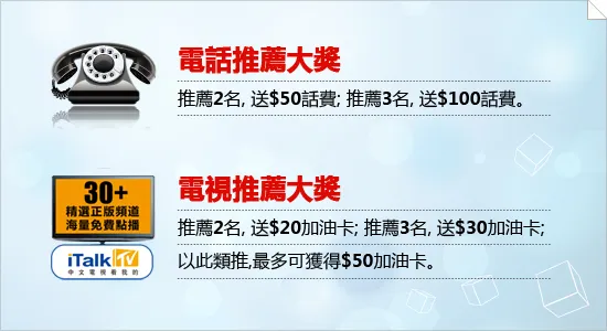 在回馈市场的同时,我们也借十周年之机,用心感恩老用户。特在3月再次开始广受大家喜爱的特殊推荐优惠,并给出了最为实惠、实用的奖品。电话用户只要推荐3名亲友,就相当于获得最少4个月免费的服务了呐。推荐电视则能赢得加油现金卡,在油价上涨的日子里,iTalk为您买单。还不赶快推荐亲友,一起用iTalk电信组合省钱,开始下一个美丽的十年吧!