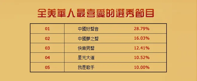 火热进行中的"全美华人最爱看"大型系列票选活动日前结束了第三周"全美华人最爱看的选秀节目"的投票和抽奖。结果,去年惊世而出,今年热度不减的中国好声音,无悬念地以超过28%的得票率当选全美华人心中的选秀节目之王。与第一名的高票当选相比,第二名、第三名的争夺便显得有些胶著。无论是前半年话题十足的《我是歌手》,还是有超强评委阵容的《中国最强音》都没能挤入三甲。最终的二、三名分别由美偶中国版《中国梦之声》和老牌选秀节目《快乐男声》获得。