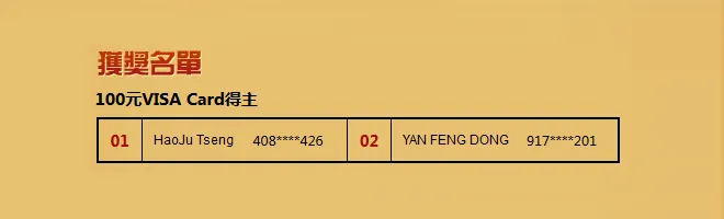 本周又有22位网友幸运获奖,奖品包括价值$100的VISA现金卡和价值$10的Amazon的购物卡。在此恭喜电话号码为******6426和******1201的两位网友获得百元大奖。