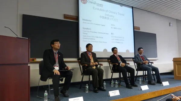 2015哈佛中国论坛于4月24-26日在哈佛大学举行。该论坛成立于1998年,每年春季举行,是北美最大的由学生组织的中国峰会。论坛研讨主题包括企业、金融、文化、社会等,邀请中国和世界的政、商、学各界杰出人士就当前中国面临的机遇与挑战,与哈佛学子和业内人士进行探讨交流。4月25日下午,主题为“中国旅游行业的变迁”的分论坛在哈佛大学科技中心举行。