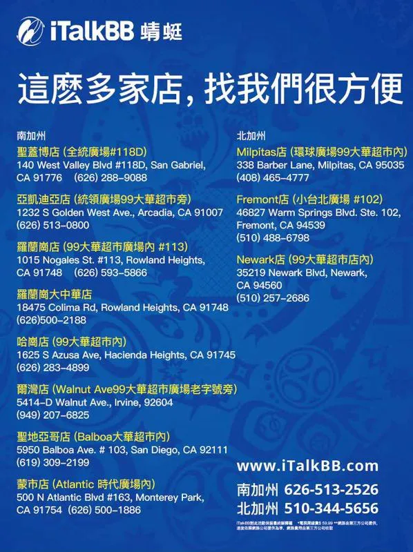 1. 强大的企业实力、品牌知名度极高目前,iTalkBB是全球最大的华裔和韩裔电信运营商,在美国、加拿大、澳大利亚、新加坡等国开设了超过30家体验店,全球用户超过120万。在美国,iTalkBB的品牌知名度在北美华人中高达80%,是北美最具影响力的华人品牌之一。