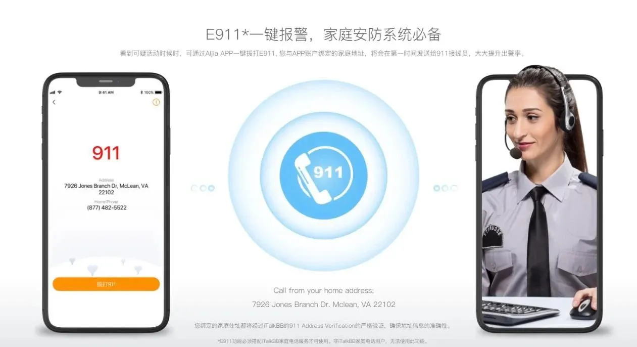 AIjia无线安防摄像头的APP可以进行E911一键报警功能,及时把案发地址直接发送给救援中心,无须担心由于案发不方便说话或紧张导致地址出错。