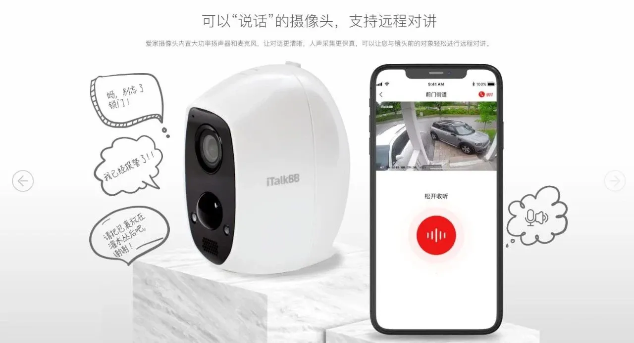 iTalkBB AIjia无线安防摄像头,110度广角拍摄,1080P高清拍摄,拍摄范围可远至7米,家门前有可疑人员经过,都会触发智能人形识别,安防摄像头会开启拍摄,并实时给住户手机发送消息推送。