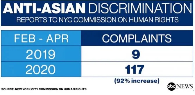 以疫情震中的纽约为例,今年2~4月,纽约市人权委员会收到的反亚裔歧视投诉较去年同期激增92%。