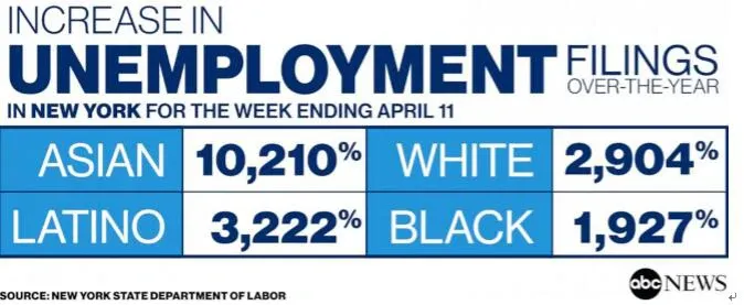 截至4月11日,纽约州亚裔美国人失业申请人数同比增长了惊人的10,210%,2019年失业501人,今年有51653人,这在所有种族中是最高的。同期对比来看,纽约黑人失业申请激增量为1927%,白人增长2904%,西裔或拉美裔增加3222%。