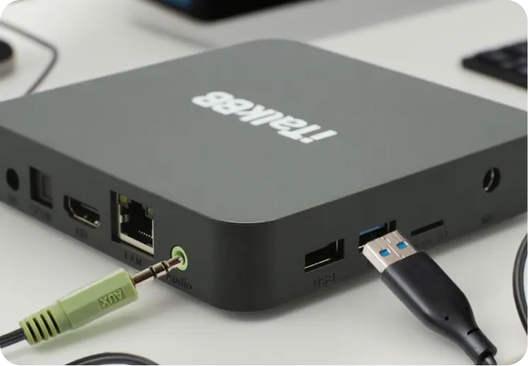 将3.5mm AUX线和USB线插入iTalkBB 中文电视机顶盒,接通电源即可开启。