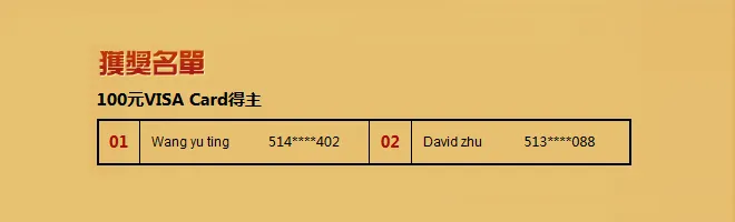 共有44位网友在上两週的投票抽奖活动中幸运地被抽中,获得了$100 Visa现金卡和$10的Amazon购物卡。以下為本期获得百元现金卡的网友信息。