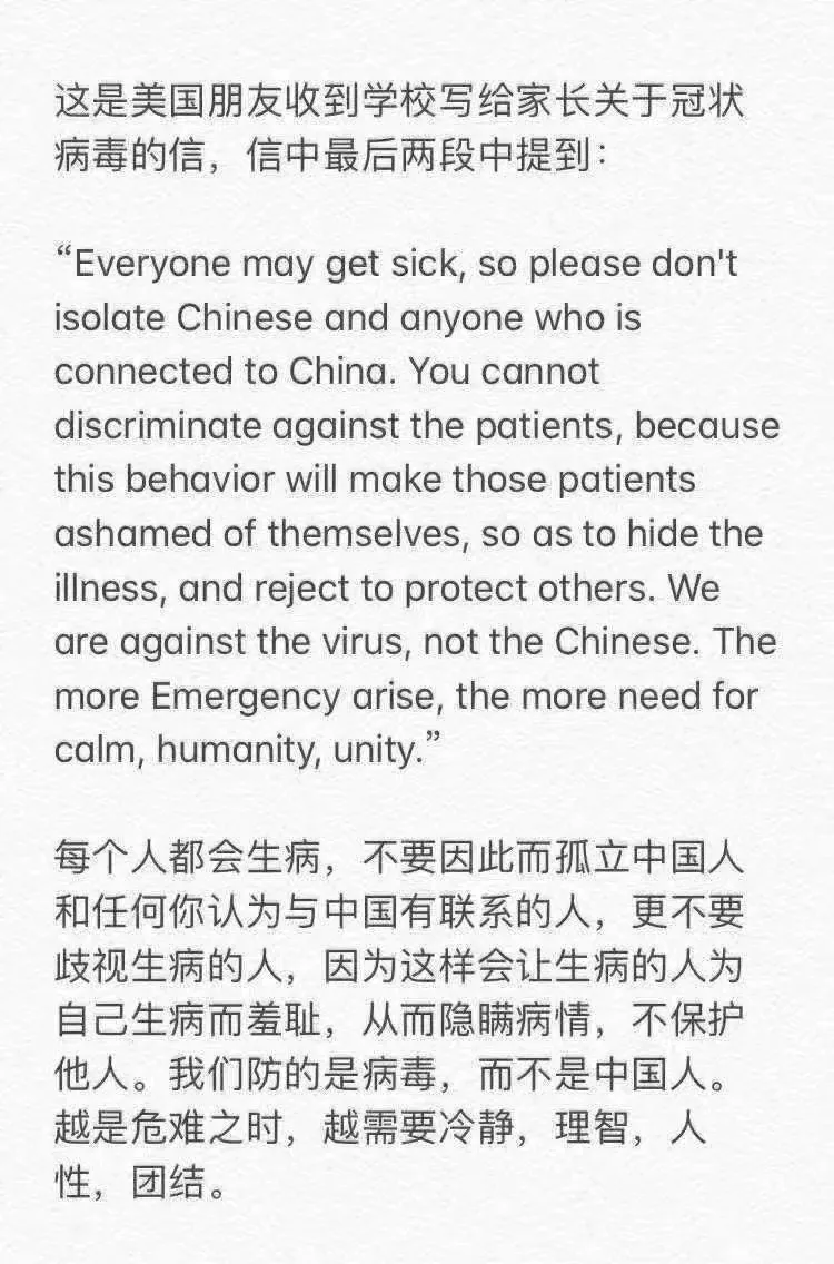 本次肺炎疫情导致部分人看到“武汉”、“中国”等字眼的时候,会过度紧张。新闻中出现过武汉车牌招拦截围攻,有武汉亲属的人被打等画面,让人心寒。不少华人呼吁,“每个人都会生病,不要因此孤立中国人,以及任何你认为与中国有关联的人,更不要歧视生病的人”,“我们的敌人是疫情,而不是武汉人”。