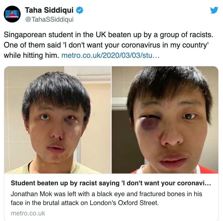 走在伦敦热闹繁华的牛津街,也难逃飞来横祸,只因这幅天生的亚洲面孔,就被边打边骂“我不想新冠病毒到我的国家来”。