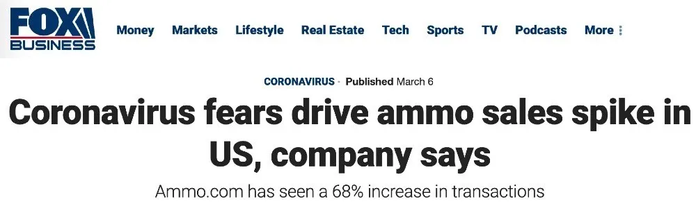 根据在线弹药零售网站Ammo.com,从新冠病毒在美国引起关注的2月23日开始,直到3月4日的11天内,枪支弹药交易量增长了68%。