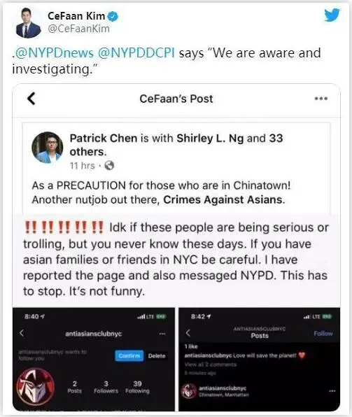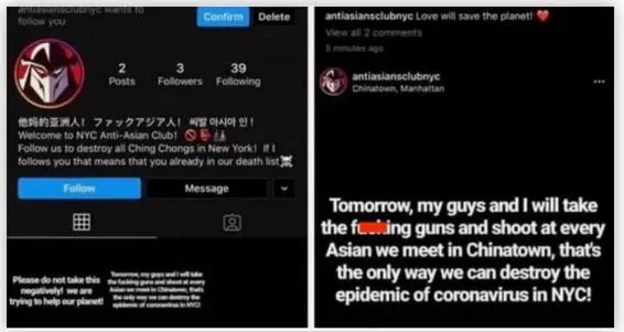 4月初,ins上一位名为“antiasianslubnyc“的账号发布消息称:“将枪杀在中国城遇到的每一个亚洲人,这是摧毁纽约新冠病毒大流行的唯一方式。”另一条状态里称“爱将拯救地球,请不要觉得我们是在宣传负面消息!我们只想以此来帮助我们的星球!”