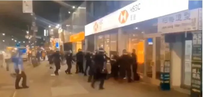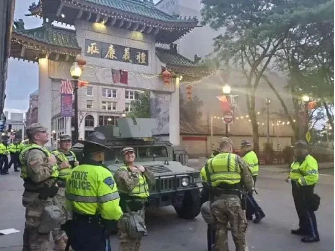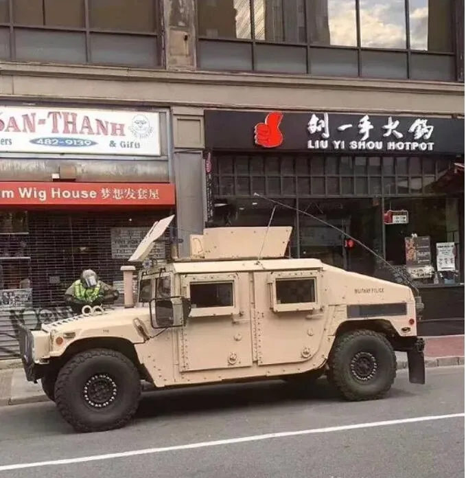 波士顿唐人街,军警出动,装甲车上街,希望能尽快和平地平息骚乱。
