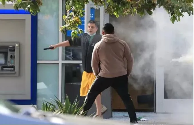 在洛杉矶,市民自发持枪保护银行,维护社会的秩序和尊严,不允许抢劫的发生。