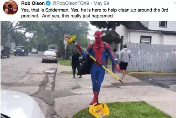 在抗议起源的明尼阿波利斯,甚至蜘蛛侠都出动了,主动清扫暴乱后的社区,堪称正义化身的典范。