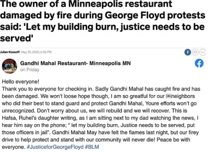 明尼阿波利斯一位店主的餐厅在抗议暴乱中被烧毁,但他并不介意,表示餐厅烧毁可以重建,让建筑燃烧吧,正义需要得到伸张。