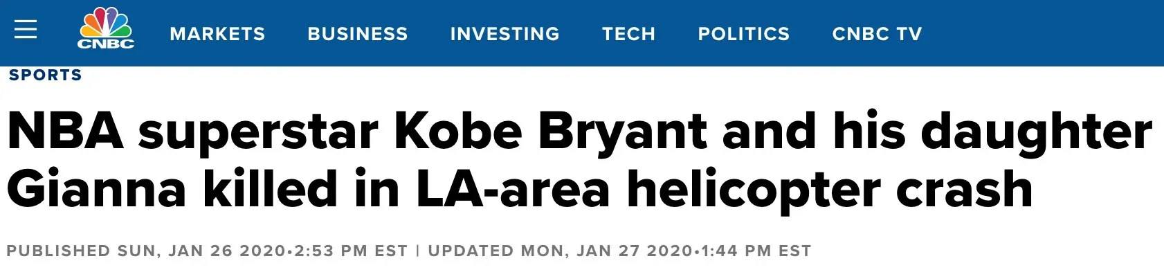 国内疫情刚刚爆发,华人惊魂未定的1月26日,又传出美国篮球巨星科比和二女儿Gianna Bryant私人直升机坠毁的消息,机上9人全数罹难……