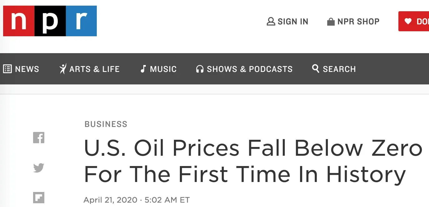 4月21日,原油期货价格史上首次跌至0元以下,收盘-37.63美元。全球宅家防疫,石油需求大幅降低。原来几十刀上百刀的石油,现在贴钱让买家拉走,实在是存不开了。