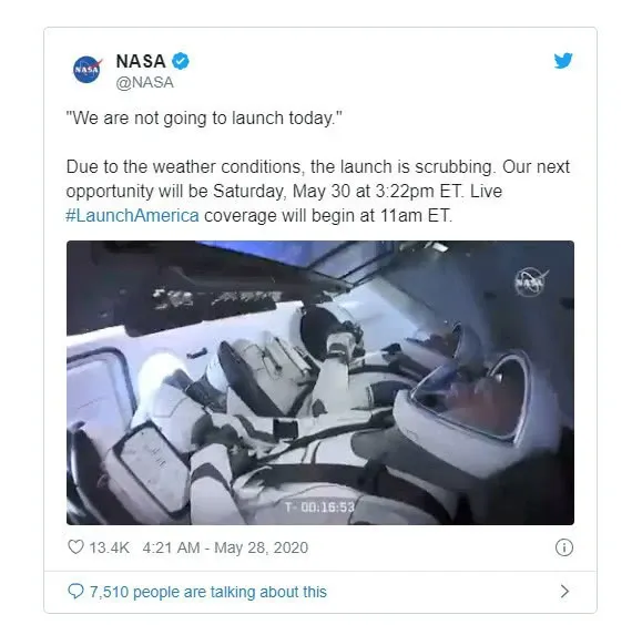 5月27日4:33pm,马斯克的SpaceX龙飞船和NASA一切准备就绪,万众瞩目,全球期待。然而,发射前12分钟却宣布因为天气无奈改期。