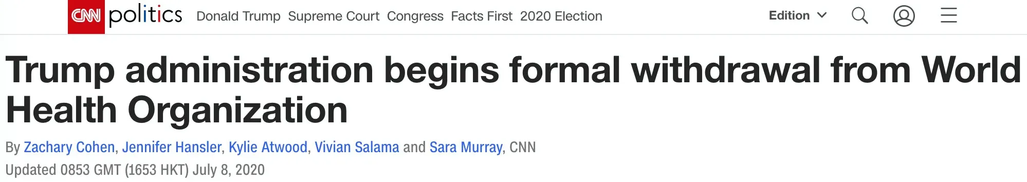 从4月宣布暂停缴纳会费、酝酿撤资开始,川普就对WHO世卫组织越看越不顺眼。终于在7月初宣布启动退出程序,需要按要求提前1年告知,并且缴清所欠会费。