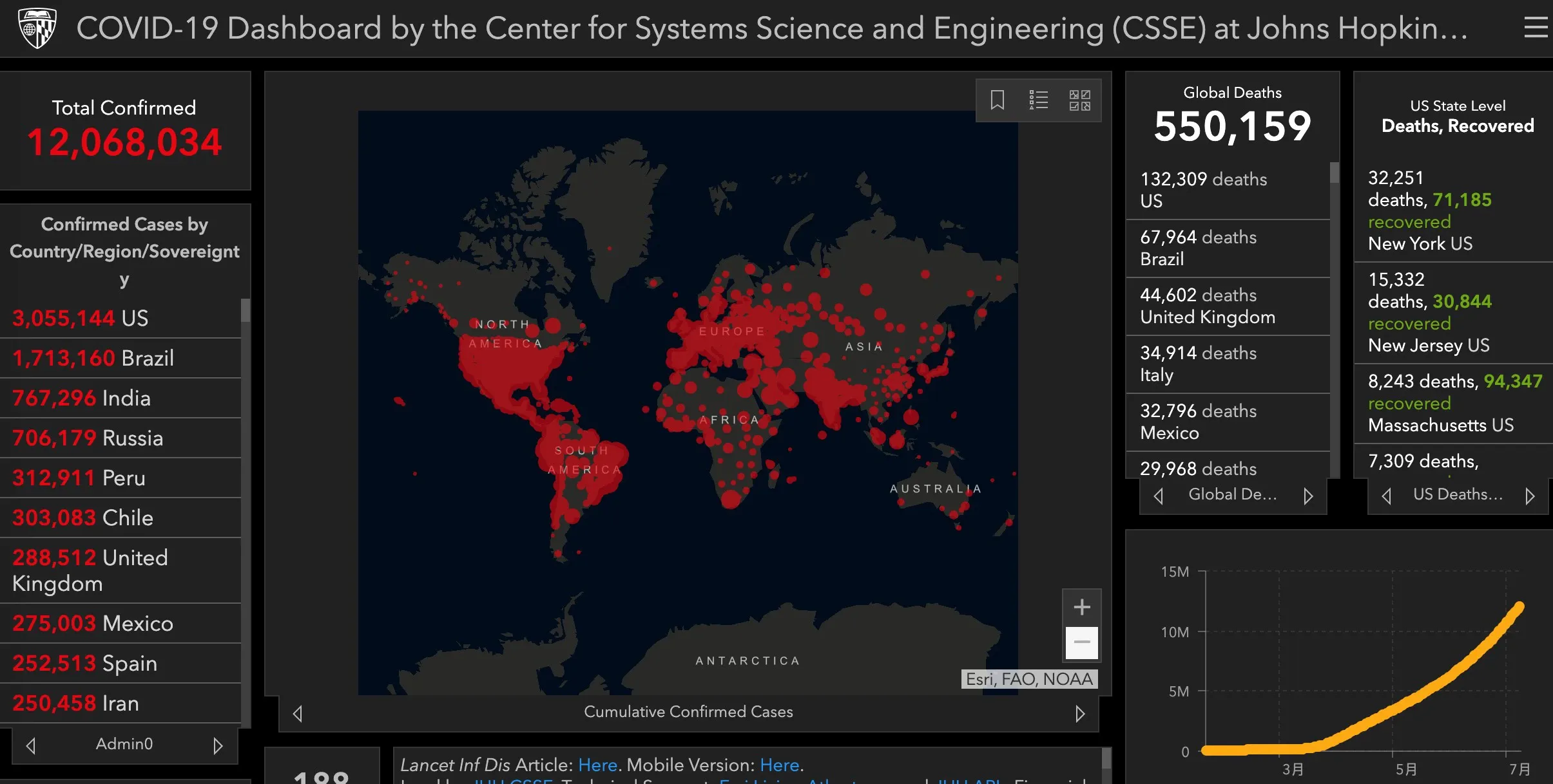根据约翰霍布金斯大学的数据,截至7月9日,全球累计新冠病毒感染人数已经超过1200万。