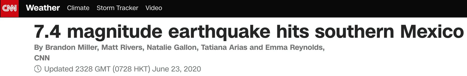 6月23日23时29分,墨西哥发生7.4级地震,震源深度10km,至少5人在地震中身亡。震级惊人,但这已经是2020年发生的第六次7级以上地震了,最大的一次发生在1月29日的古巴南部。