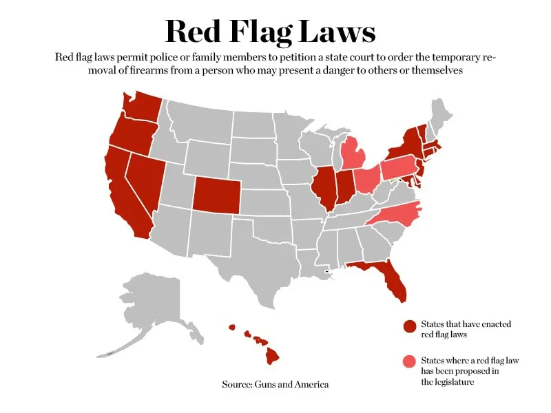 事情还要从2016年的“红旗法”说起。为防止大规模枪击事件的发生,2016年颁布的特殊限制令“红旗法”允许警察、直系亲属请求法官没收某人的枪支,短则3个月,最长5年。