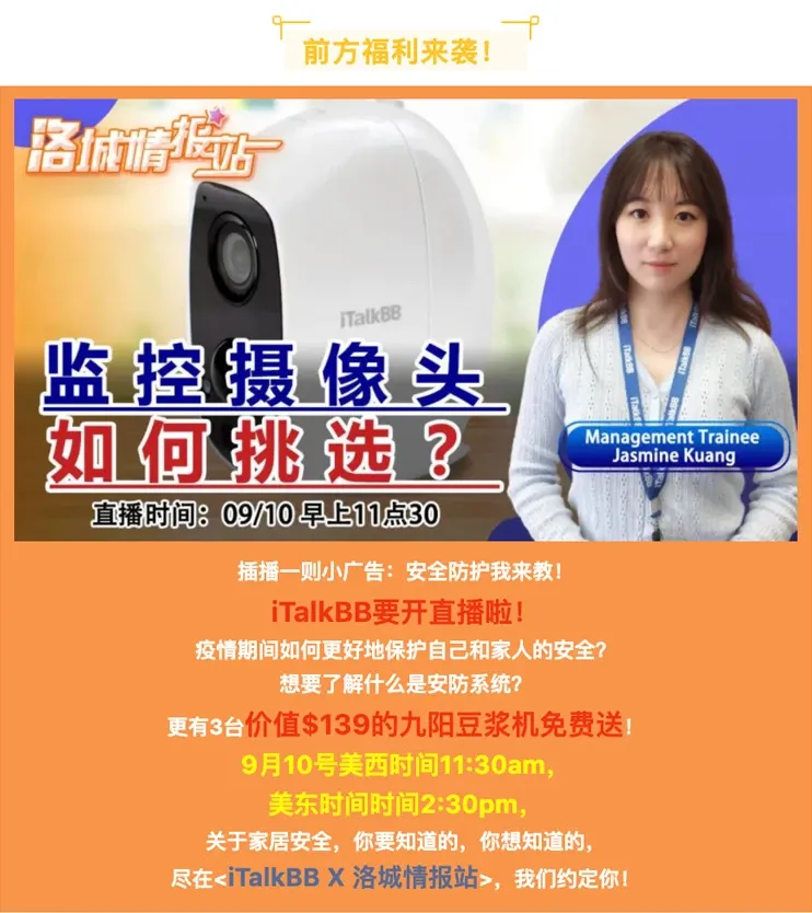 由中国女排国家队教练郎平代言的iTalkBB AIjia家居安防产品,品质有保障。iTalkBB在美国有17年的品牌历史,全美遍布实体体验门店,中英粤三语服务,为华人量身定做的安防服务!