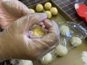 做好的饼皮分成一剂一剂,压成圆饼之后包入馅料,底部封口后,在表面滚一层干粉或者刷一层蛋黄油,再放到月饼模具里压制成型。