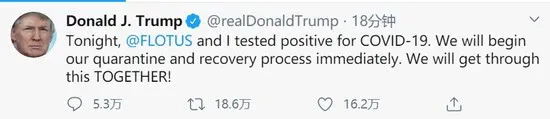 “今晚,梅拉尼娅和我新冠病毒检测呈阳性,我们将立即开始隔离和治疗康复,我们会一起度过这个难关!”
