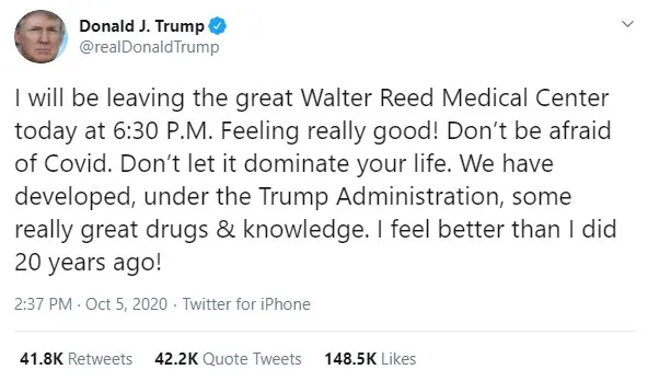 特朗普周一(10月5日)晚上出院前再度发推文,告诉美国人不要害怕新冠病毒。他说:“我现在感觉比20年前还要好!”并称:“我会很快重回竞选正轨!”