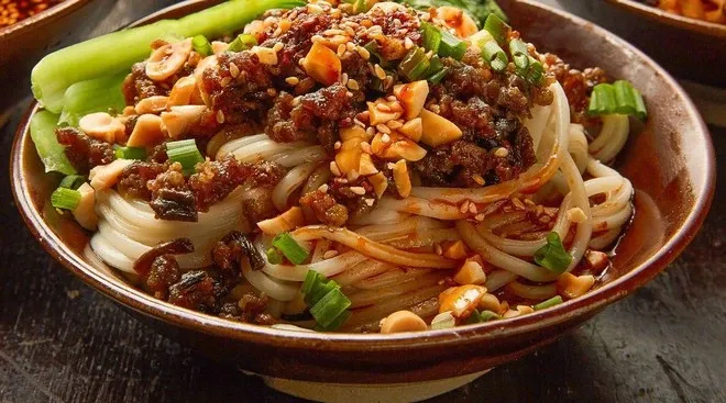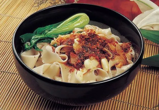 担担面是中国四川的特产小吃,担担面相传为1841年一个绰号叫做陈包包的自贡小贩创制,因为早期是用扁担挑在肩上沿街叫卖,所以叫做担担面。担担面面条细滑,主要佐料为红辣椒油、芝麻酱、肉末、川冬菜、碎花生或花生粉、花椒面、红酱油、蒜末、豌豆尖和葱花等,口味油香麻辣,清凉适口。