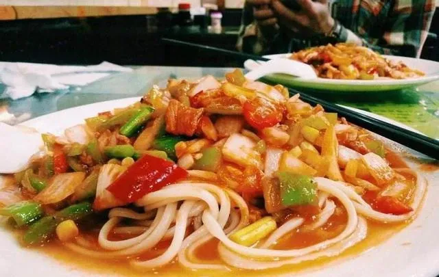 拉条子在新疆当地俗称为拌面,是由手工拉制而成的面食,是新疆人饭桌上一年四季都必不可少的一种美味佳肴。新疆拌面的种类非常多,在新疆,几乎所有菜肴都可以和拌面联系在一起,比如常见的新疆大盘鸡,也会配上一份拌面食用。