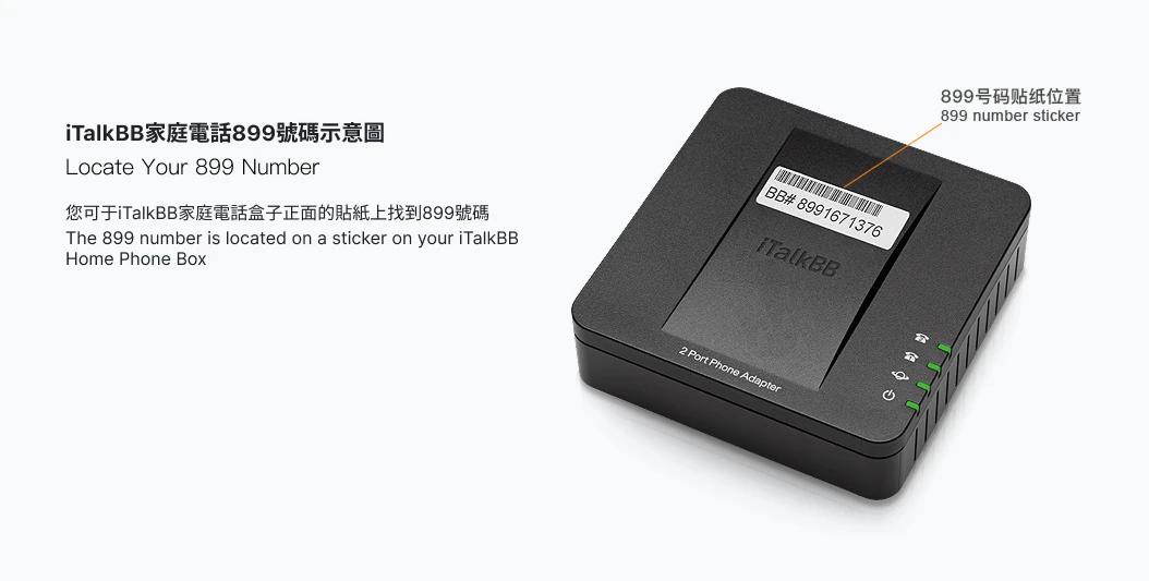 899號碼是您的iTalkBB座機電話內部號碼,在您的iTalkBB座機電話盒上可找到以“899”開頭的號碼,如下圖所示: