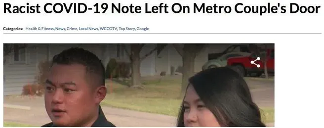 在明尼蘇達州,壹對亞裔夫婦的家門被鄰居貼上字條,上面寫著:“我們在監視妳,把病毒帶回中國...”的歧視性內容。