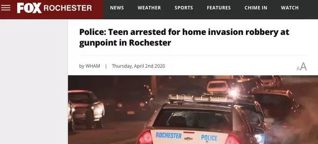 4月2日位於紐約Rochester的警方逮捕了壹名未成年入室搶劫,年僅15歲的犯罪嫌疑人持槍闖進受害人家裏,並開槍逃走。