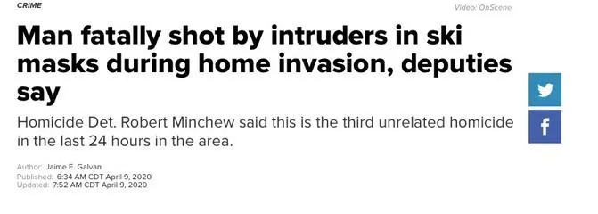 4月9日位於德州Harris County發生入室搶劫交火案件,2-4名戴著滑雪面具的劫匪闖入公寓,造成壹人死亡,壹名嫌疑人受傷。據警察稱,這已經是這壹地區24小時內發生的第三起入室搶劫案。