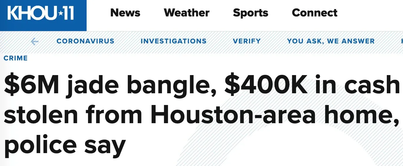 案發2個月後,仍然沒有任何線索。Hedwig Village地方警探Terry Wu表示,屋內所有能想象到的角落,都被翻遍了,被盜物品中最值錢的是壹只稀有玉鐲,主人稱價值600萬美元,並且有可以佐證其價值的材料。