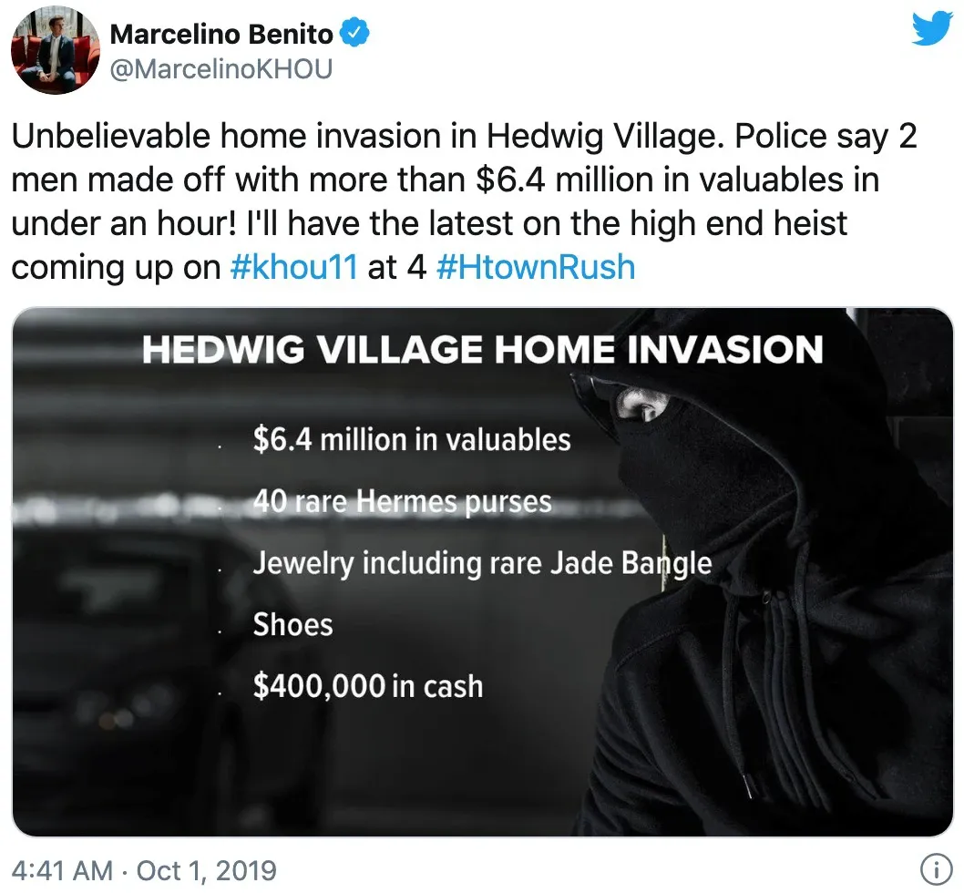 去年8月6日早晨6:30左右,休斯頓10號高速附近Hedwig Village發生了壹起重磅蒙面入室搶劫案,震驚整個社區