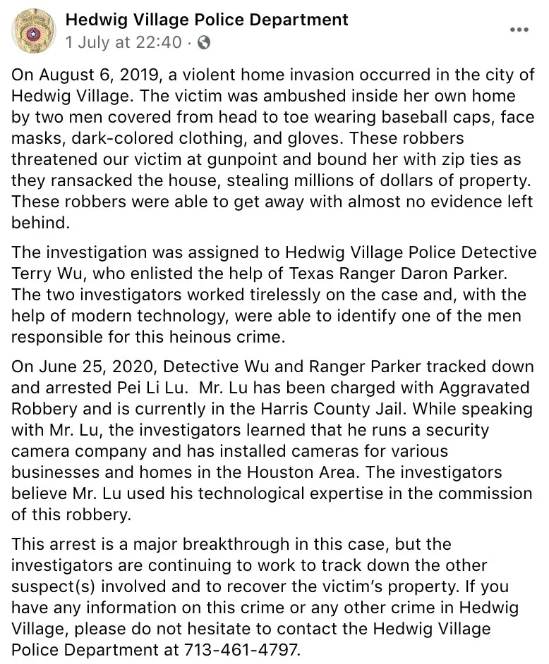 據口供交代,Pei Li Lu經營壹家安防攝像頭公司,客戶包括休斯頓地區多家企業和家庭。警方判斷他正是利用專業之便鉆了空子,完成了這起驚天搶劫。