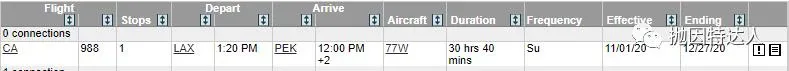 CA988(洛杉磯 – 北京,天津隔離):13:20 – 12:00 +2,每周日執飛