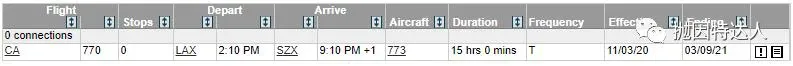 CA770(洛杉磯 – 深圳):14:10 – 21:10 +1,每周二執飛