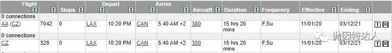 CZ328(洛杉磯 – 廣州):22:20 – 05:40 +2,每周五、日執飛