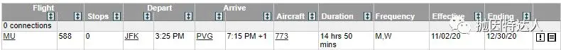 MU588(紐約JFK – 上海浦東):15:25 – 19:15 +1,每周壹、三執飛