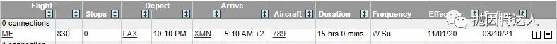MF830(洛杉磯 – 廈門):22:10 – 05:10 +2,每周三、日執飛