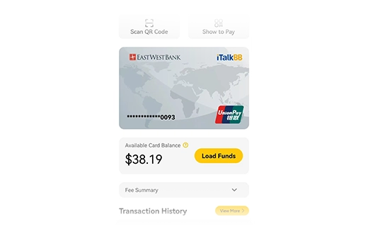 5.USD Funds must be loaded to the iTalkBB UnionPay Prepaid Card before the card can be used to make purchases. The iTalkBB UnionPay Prepaid Card can only be loaded/reloaded from a qualifying East West Bank checking account. You must be enrolled in East West Bank's Online Banking Service to access this feature. Additional terms and conditions apply. Learn more