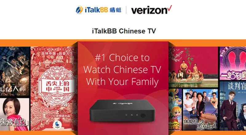iTalkBB, a leading Internet based Chinese TV and Telecom service provider in the United States, announced a new partnership with Verizon Fios to offer Chinese TV programming with bundled Internet access, telephone, and television service. As part of this strategic partnership to entice the multicultural market and introduce new users to it, iTalkBB offers Fios Internet customers the latest "hit" Chinese movies, TV series, and variety shows, as well as over 60 of the most popular live channels from China, Hong Kong and Taiwan, available streaming to an iTalkBB OTT box.